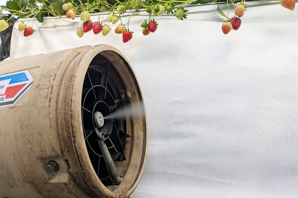 当園が導入した細霧ミスト機械システムはミストが蒸発する時の気化熱ひんやり効果を利用して、夏のいちごやトマトの苗作りに役立てています。